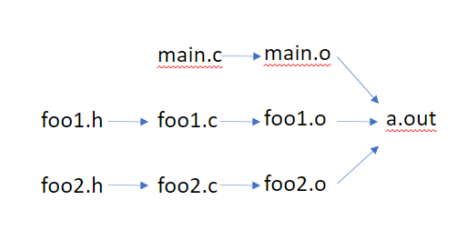 main.c, foo1.c, foo2.c를 각각 컴파일하여 Object파일을 생성하고, 링크를 통해서 a.out을 생성합니다.