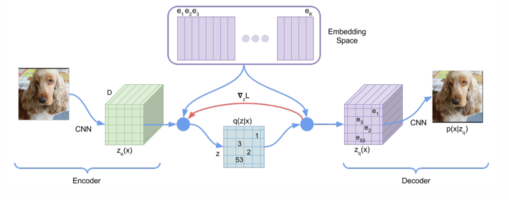 여기서 $\nabla_z L$는 Straight-Through Estimator로, 중간의 quanization 부분을 건너 뛰고 decoder 입력단까지 온 gradient를 encoder 끝단으로 복사해주는 trick이다.